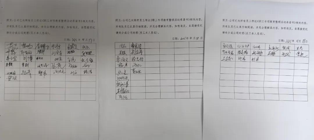 公司組織全體人員簽署《職工專項教育整頓活動承諾書》,健全動態(tài)監(jiān)管制度,把報備、提醒、監(jiān)督等工作做扎實。同時,建立“單位+家庭”雙監(jiān)督機(jī)制,充分發(fā)揮“八小時外”的家庭監(jiān)督作用,做到家屬常問常提醒,形成全天候監(jiān)督管理閉環(huán)。